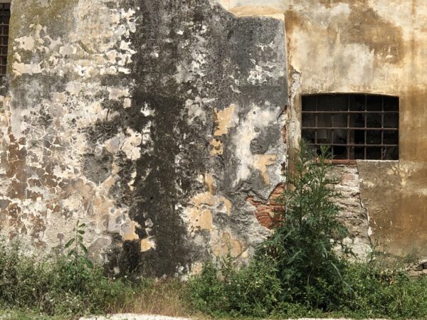 Das Bild zeigt eine verwitterte Wand mit einer rauen Textur. Die Oberfläche ist teilweise mit abblätternder Farbe in unterschiedlichen Grautönen sowie beigen und orangefarbenen Stellen bedeckt. An einigen Stellen sind Risse und unregelmäßige Flecken sichtbar, die auf eine längere Witterungseinwirkung hindeuten. Im Vordergrund wächst dichtes grünes Gras und einige kleine Pflanzen, die sich an der Wand befinden. Die Wand hat auch einige Bereiche mit rotem Ziegelwerk, die teilweise freigelegt sind.